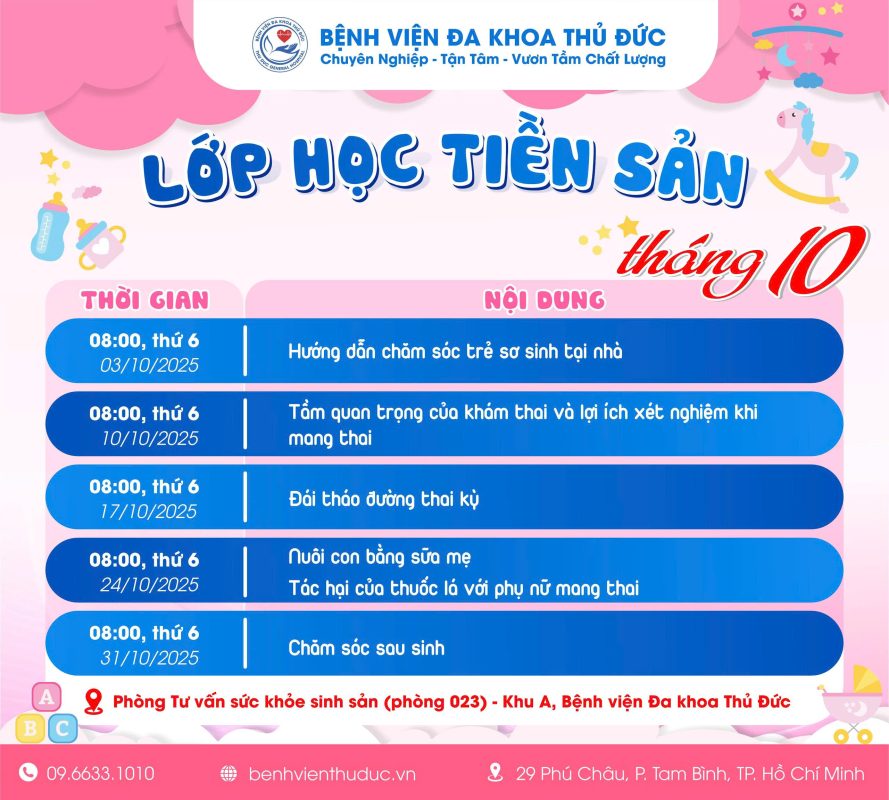 Tháng 10 này, Bệnh viện Đa khoa Thủ Đức tiếp tục mở lớp học tiền sản miễn phí với nhiều chủ đề thiết thực, giúp mẹ thêm tự tin chăm sóc bản thân, nuôi dưỡng bé yêu khỏe mạnh ngay từ trong bụng mẹ.