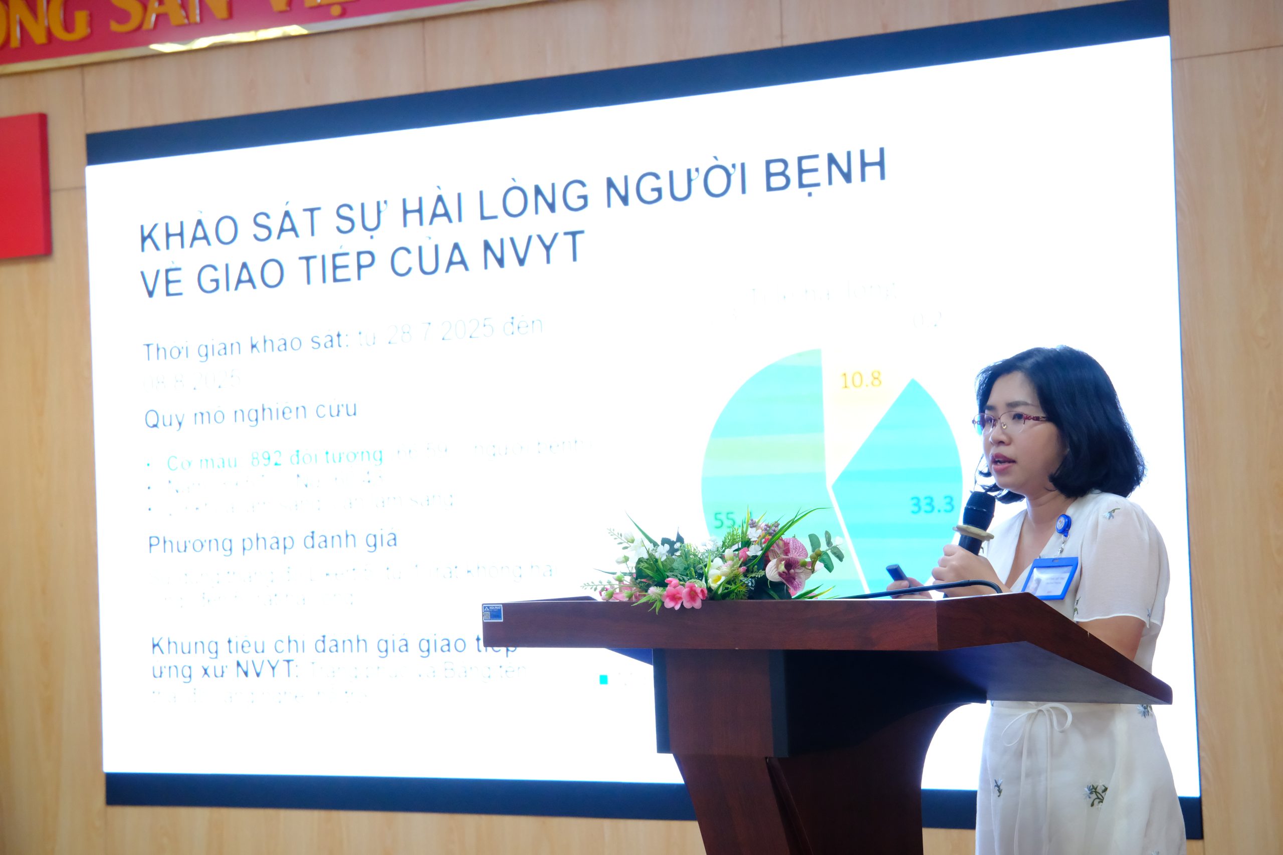 Tại chương trình, ThS. Huỳnh Mỹ Thư – Trưởng phòng Quản lý chất lượng đã công bố kết quả khảo sát ý kiến của người bệnh và người nhà về kỹ năng giao tiếp, ứng xử của nhân viên y tế. Kết quả khảo sát đã cho thấy một cái nhìn khách quan, toàn diện về thực trạng, ghi nhận những ưu điểm đồng thời thẳng thắn chỉ ra những hạn chế trong công tác giao tiếp ứng xử tại bệnh viện. Đây là cơ sở quan trọng để bệnh viện xây dựng các giải pháp cải tiến hiệu quả.