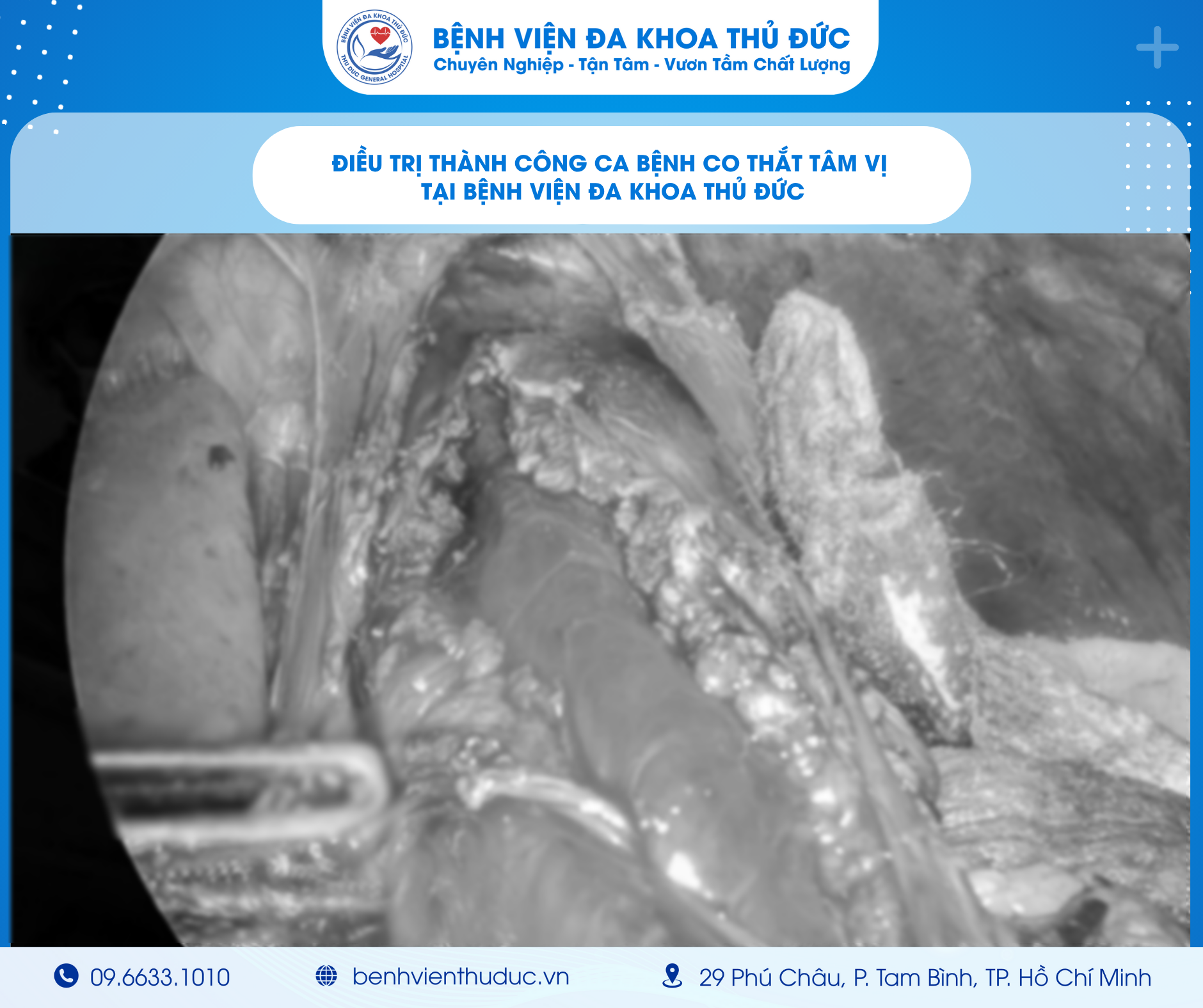 Ngày 07/10/2025, sau khi nhập viện tại Bệnh viện Đa khoa Thủ Đức, chị H được thực hiện các thăm khám lâm sàng, nội soi, xét nghiệm cận lâm sàng và chụp CT. Sau đó, bệnh nhân được chỉ định phẫu thuật Heller kết hợp tạo hình tâm vị theo phương pháp Dor. Cuộc phẫu thuật kéo dài gần 2 giờ đã được thực hiện thành công với kỹ thuật cắt dọc lớp cơ ở vùng tâm vị và một phần thực quản, đồng thời tạo van bán vòng trước bằng đáy vị để ngăn ngừa biến chứng trào ngược sau mổ.