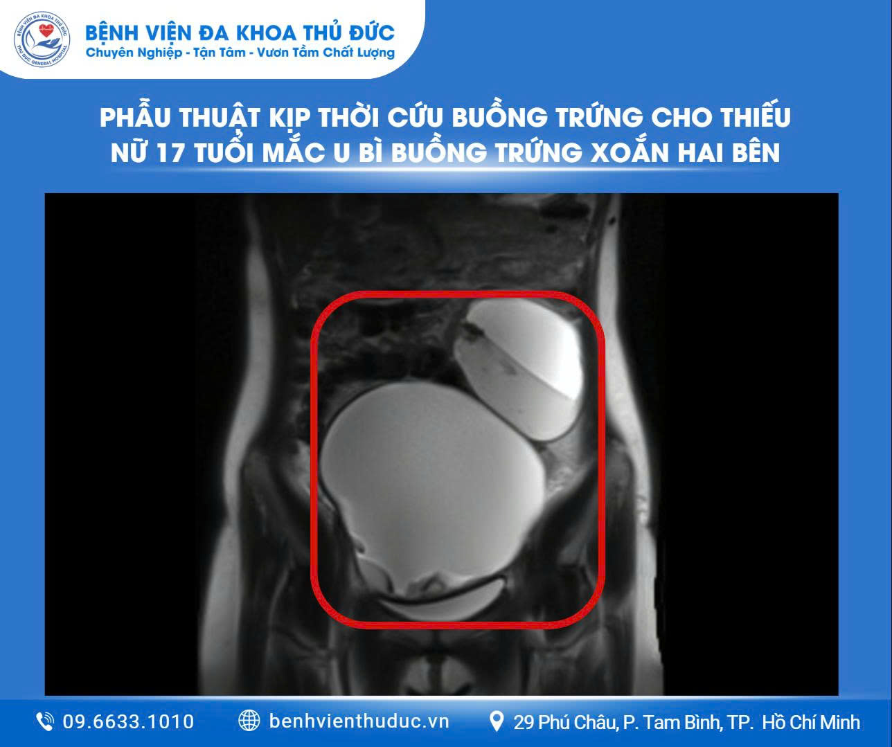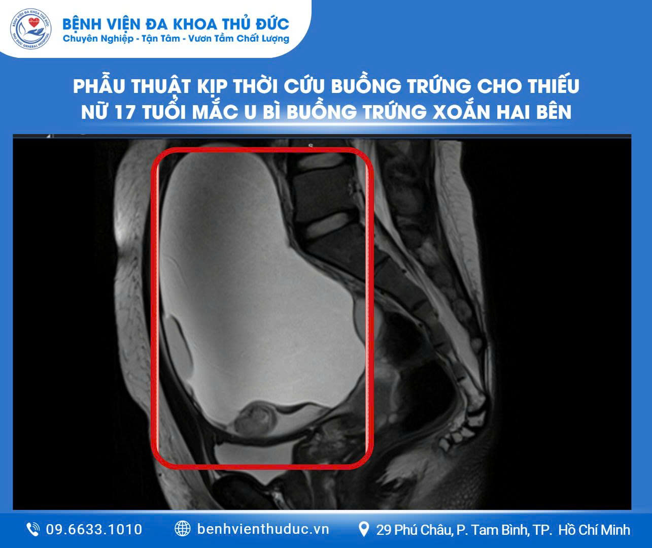 Kết quả MRI cho thấy tử cung không bất thường, tuy nhiên hai buồng trứng đều có khối u choán chỗ. Khối u buồng trứng phải kích thước khoảng 13×15 cm, khối bên trái 8×10 cm, bên trong chứa dịch, mỡ và vôi hóa, ranh giới rõ. Cả hai khối u đều bị xoắn – một biến chứng cấp cứu nguy hiểm. Chẩn đoán xác định u bì buồng trứng hai bên xoắn.