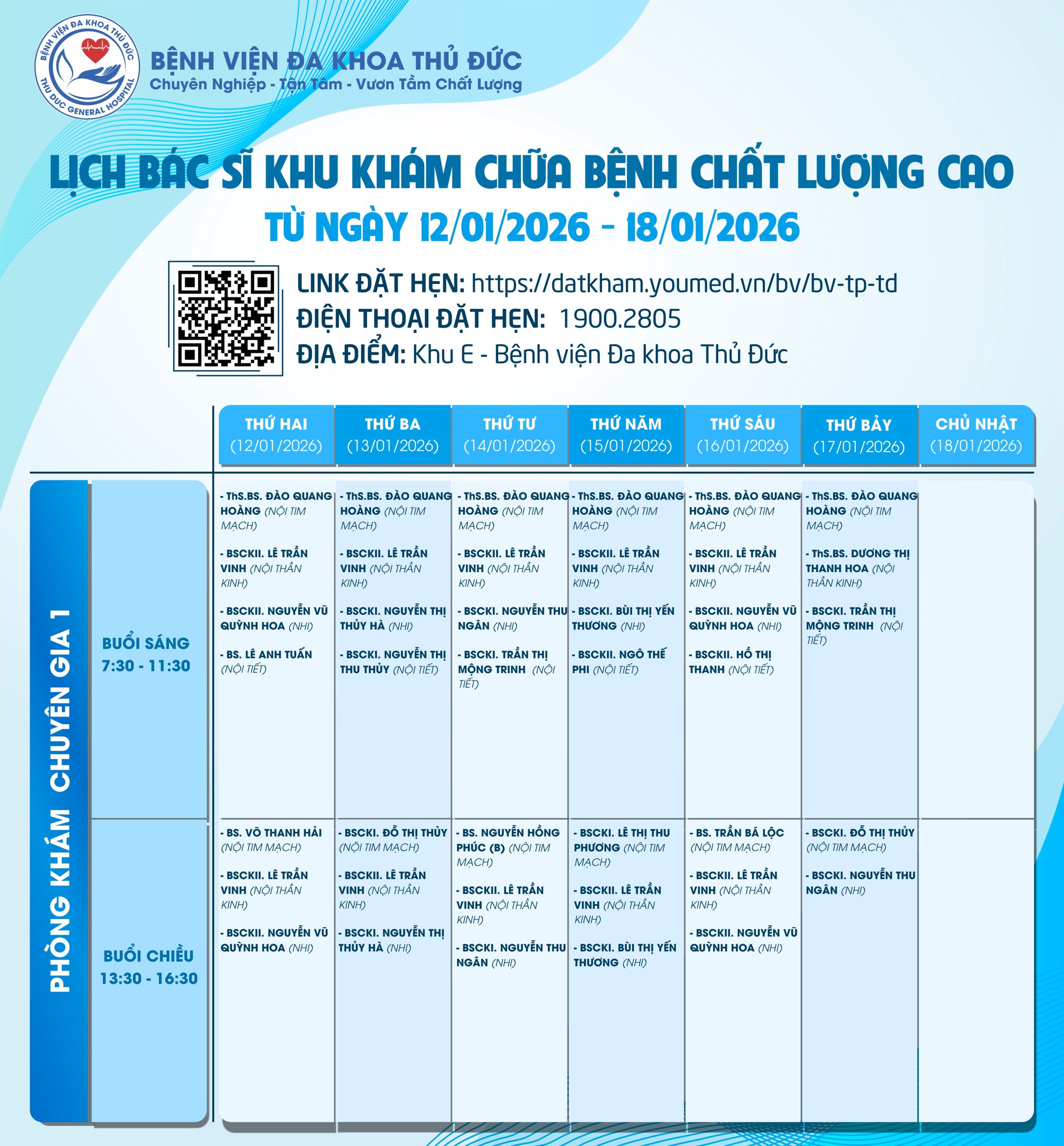 Lịch làm việc của Bác sĩ Khu Khám chữa bệnh chất lượng caoLịch làm việc của Bác sĩ Khu Khám chữa bệnh chất lượng cao (12/01/2026 – 18/01/2026) Đã đăng trên 10/01/202610/01/2026 bởi adminbvthuduc