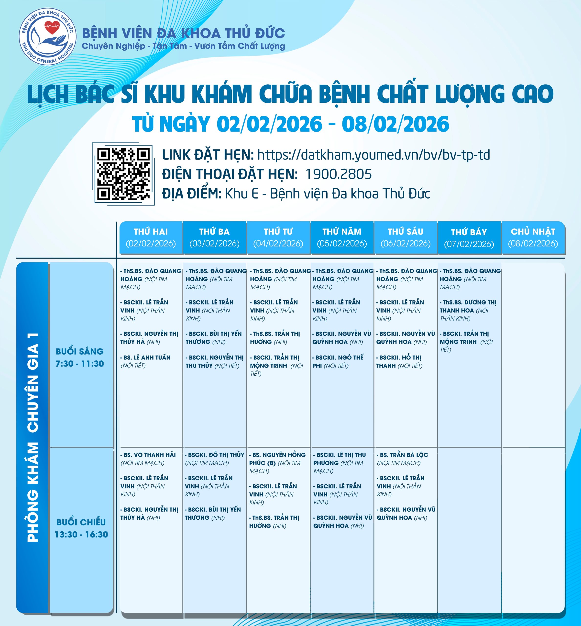 Lịch làm việc của Bác sĩ Khu Khám chữa bệnh chất lượng caoLịch làm việc của Bác sĩ Khu Khám chữa bệnh chất lượng cao (02/02/2026 – 08/02/2026) Đã đăng trên 01/02/202602/02/2026 bởi adminbvthuduc