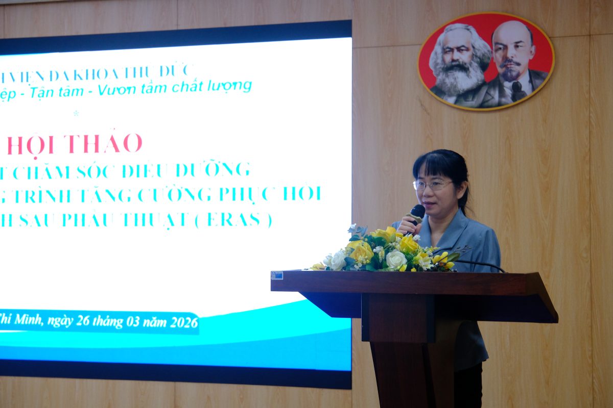Sáng ngày 26/03/2026, Bệnh viện Đa khoa Thủ Đức tổ chức Hội thảo khoa học với chủ đề “Cập nhật chăm sóc điều dưỡng trong chương trình tăng cường phục hồi sau phẫu thuật (ERAS)” dưới sự chủ trì của TS.BS.CKII Trần Nguyễn Ái Thanh – Phó Giám đốc Bệnh viện, cùng sự tham dự của các bác sĩ, điều dưỡng trưởng, kỹ thuật viên trưởng và điều dưỡng viên trong toàn viện.