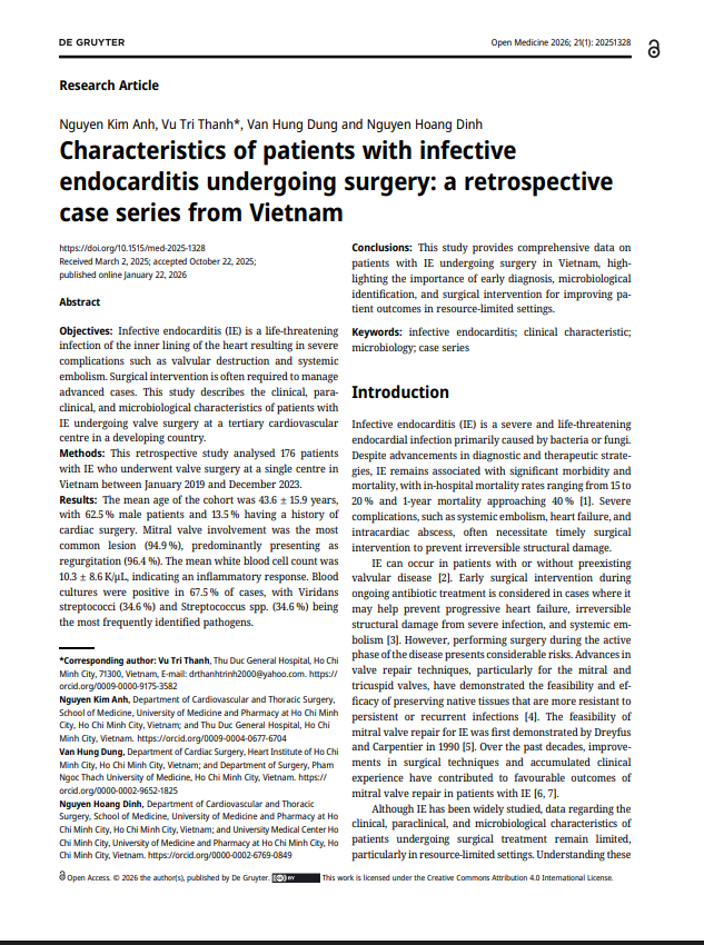 Tạp chí y khoa quốc tế Open Medicine (thuộc nhà xuất bản De Gruyter) – một tạp chí uy tín, đạt chuẩn Q2 Scopus, vừa công bố một nghiên cứu đáng chú ý về viêm nội tâm mạc nhiễm khuẩn (Infective Endocarditis – IE). Nghiên cứu được thực hiện tại Việt Nam và xuất bản trực tuyến vào ngày 22/01/2026.