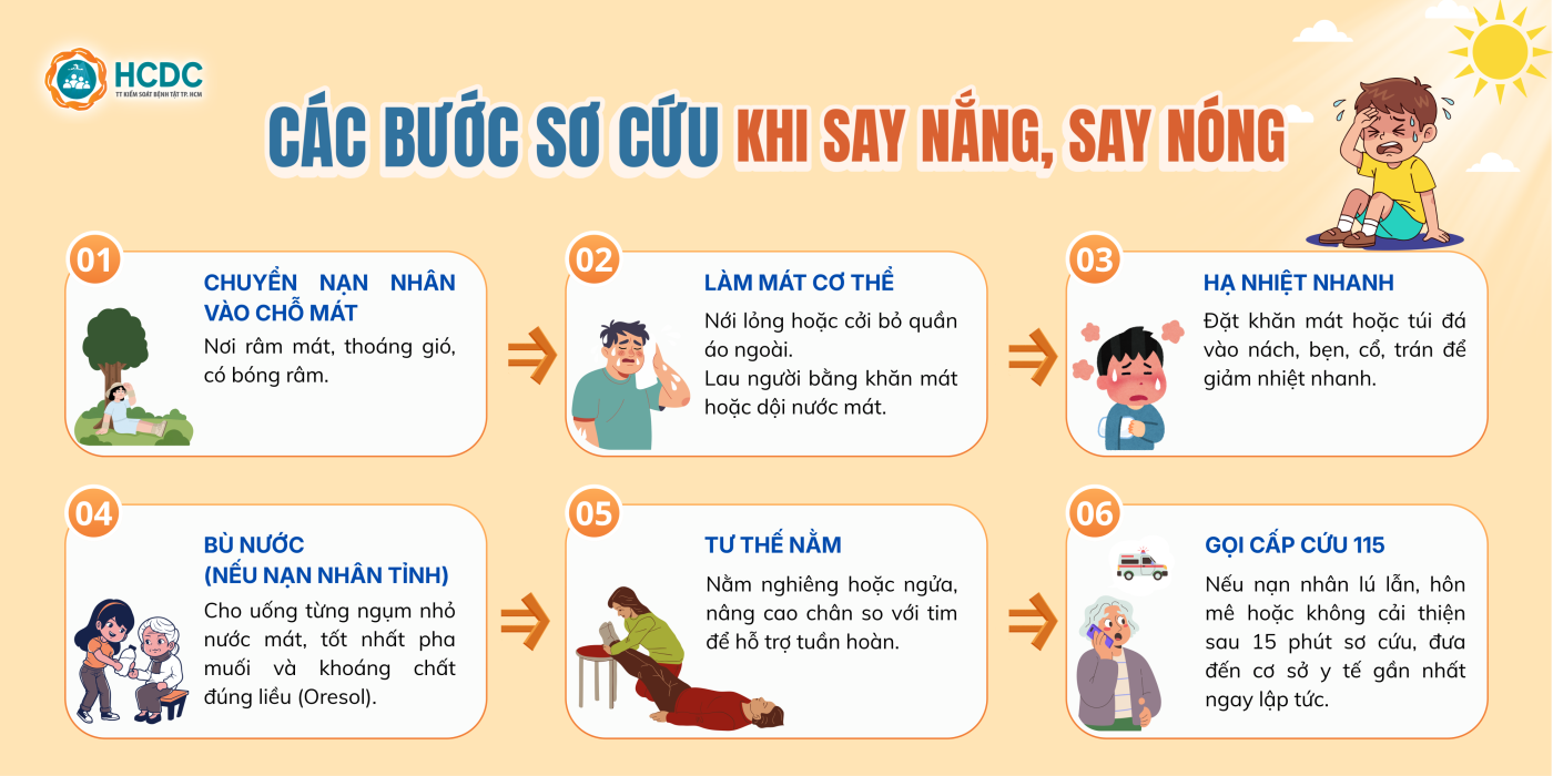 Khi phát hiện người có dấu hiệu say nắng, say nóng, cần nhanh chóng thực hiện các bước sau: