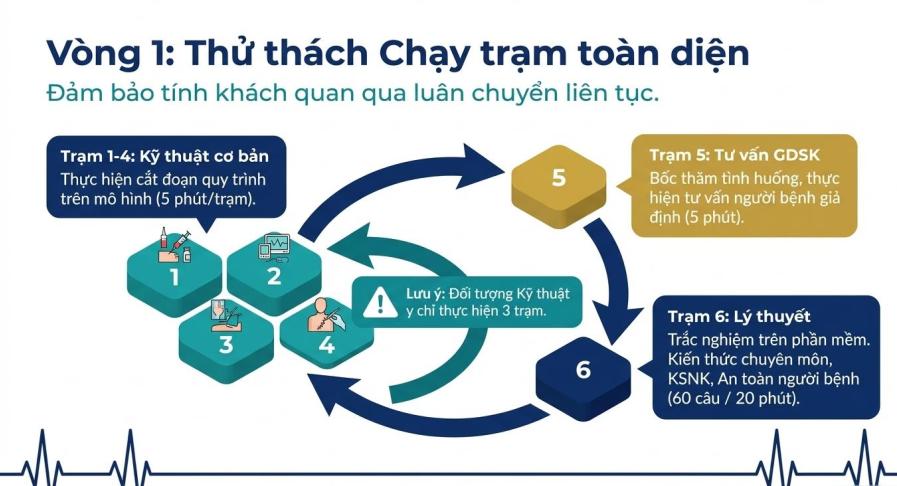 👉 Vòng 1 (Vòng loại): Tổ chức theo hình thức “Chạy trạm” đầy kịch tính! Các thí sinh sẽ phải di chuyển liên tục qua 6 trạm thi (chỉ 5 phút/trạm) để thực hiện kỹ thuật trên mô hình, xử lý tình huống tư vấn giáo dục sức khỏe và làm bài thi lý thuyết 60 câu. Sau vòng này, 09 thí sinh có điểm cao nhất sẽ hội tụ thành 03 đội tiến thẳng vào Chung kết.