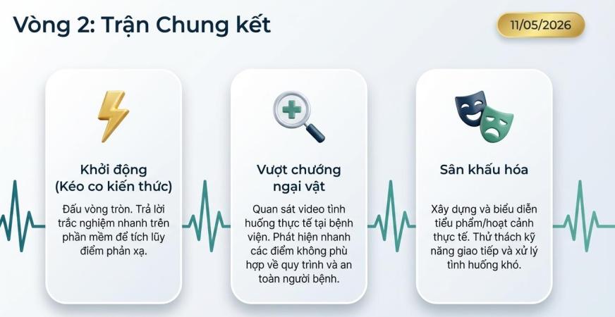 👉 Vòng 2 (Chung kết – Dự kiến 11/05/2026): Các đội sẽ tranh tài trực tiếp qua 3 phần thi vô cùng hấp dẫn: Khởi động (Kéo co kiến thức), Vượt chướng ngại vật (soi lỗi quy trình qua video thực tế) và bùng nổ cảm xúc với phần thi Sân khấu hóa – nơi tái hiện lại những tình huống chuyên môn khó quên và tôn vinh nét đẹp cao quý của ngành y.