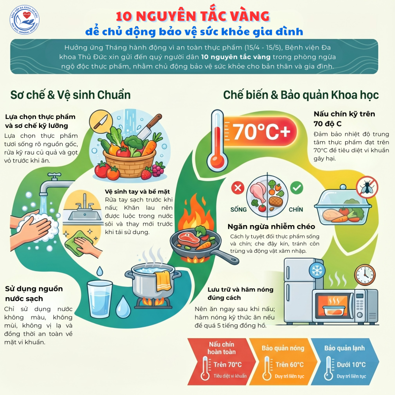 Hưởng ứng Tháng hành động vì an toàn thực phẩm, Bệnh viện Đa khoa Thủ Đức xin gửi đến quý người dân 10 nguyên tắc vàng trong phòng ngừa ngộ độc thực phẩm, nhằm chủ động bảo vệ sức khỏe cho bản thân và gia đình: