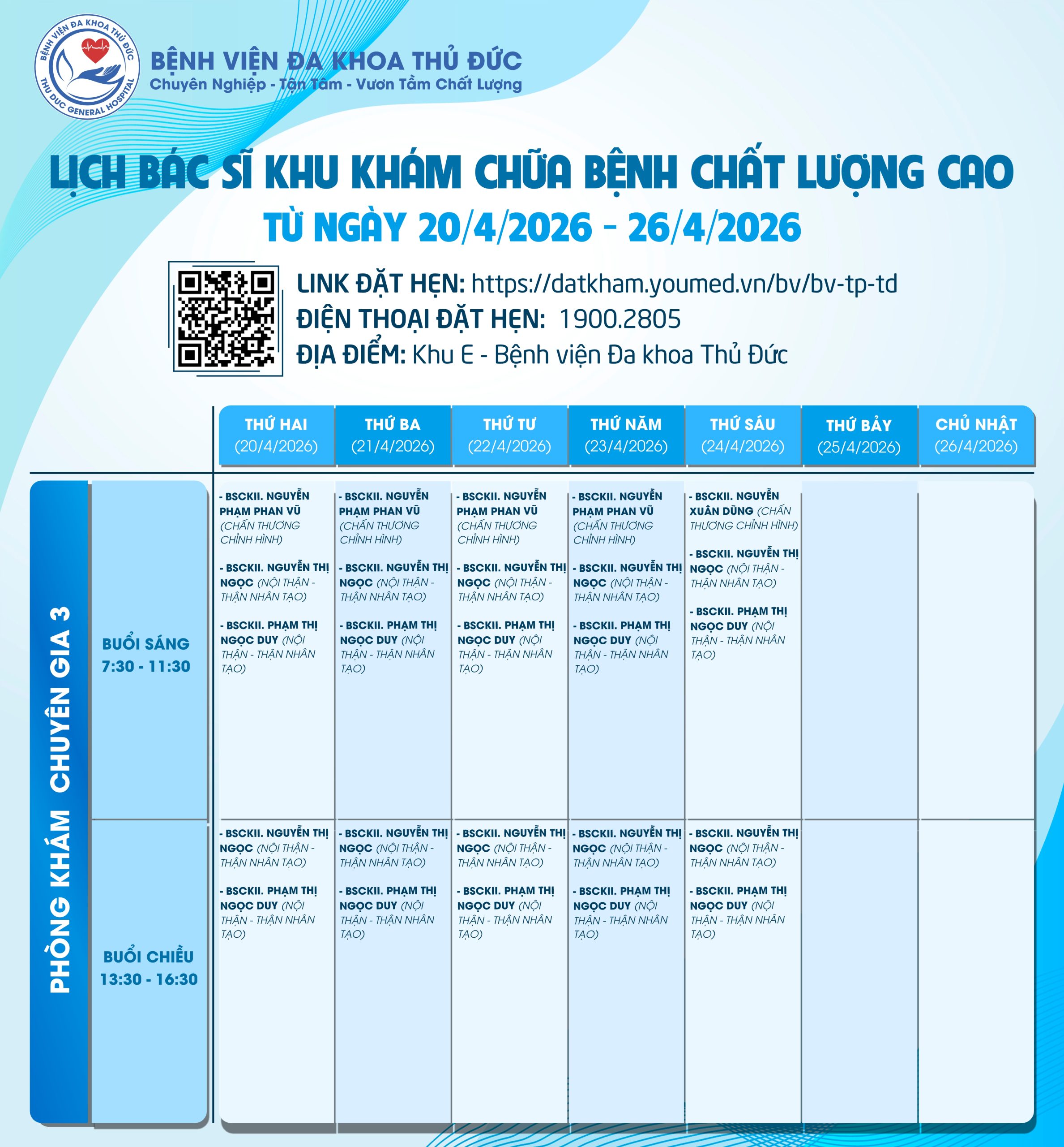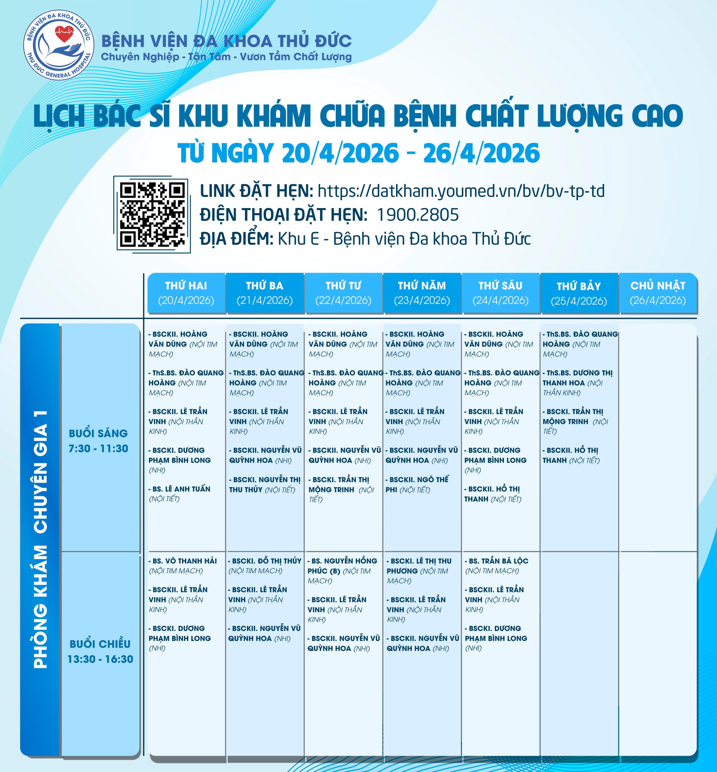 Lịch làm việc của Bác sĩ Khu Khám chữa bệnh chất lượng caoLịch làm việc của Bác sĩ Khu Khám chữa bệnh chất lượng cao (20/04/2026 – 26/04/2026) Đã đăng trên 18/04/202617/04/2026 bởi adminbvthuduc