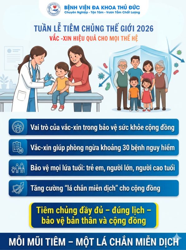 Hưởng ứng Tuần lễ Tiêm chủng Thế giới 2026, Bệnh viện Đa khoa Thủ Đức khuyến nghị mỗi người dân hãy chủ động tiêm chủng đầy đủ, đúng lịch và lựa chọn thông tin chính xác về vắc-xin từ các nguồn tin cậy. Chung tay bảo vệ sức khỏe cộng đồng hôm nay chính là đầu tư cho một tương lai khỏe mạnh, an toàn và bền vững hơn.